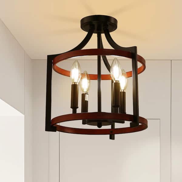 4-Light Black and Dark Wood Grain Drum Pendant Light, Rustic Farmhouse Convertible Semi-Flush Mount Chandelier