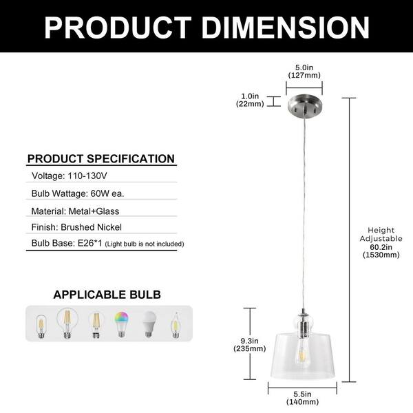 60-Watt 1-Light Brushed Nickel Shaded Pendant Light Dimmable with Seeded Glass Shade for Living Room