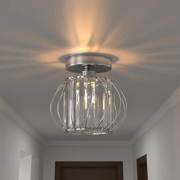 7 in. 1-Light Chrome Modern Crystal Semi Flush Mount Ceiling Light for Hallway, Entryway, or Bedroom with Cage Design