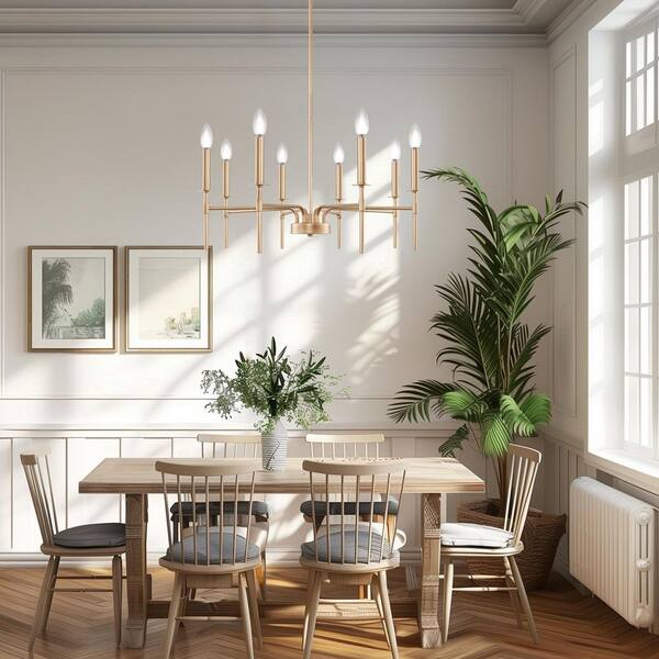 8-Light Gold Candle-Style Chandelier, Modern Farmhouse Hanging Light Fixture for Dining Room with Adjustable Height