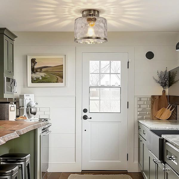 9 in. 1-Light Brushed Nickel Round Clear Glass Semi-Flush Mount with Water Glass Shade and No Bulbs Included 1-Pack