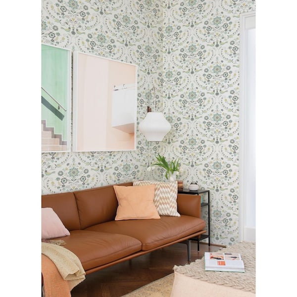 Britt Sea Green Embroidered Damask Paper Glossy Non-Pasted Wallpaper Roll