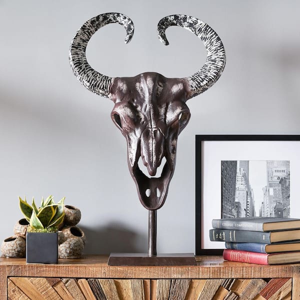 Bronze 16 in. x 25 in. Indoor Metal Handcrafted Bull Skull Table Decor with Stand