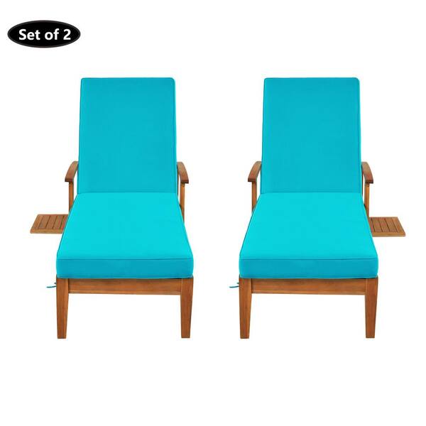 Brown 2-Pieces Wood Outdoor Chaise Lounge with Blue Cushion, Wheels and Sliding Cup