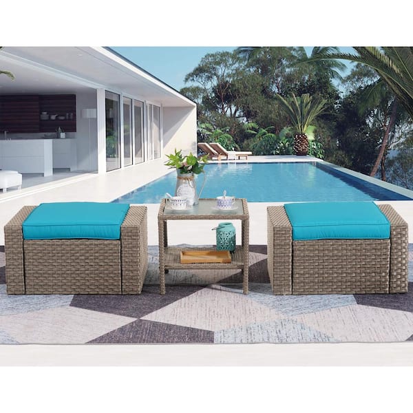 Brown 3-Piece Wicker Patio Conversation Set with Blue Cushions