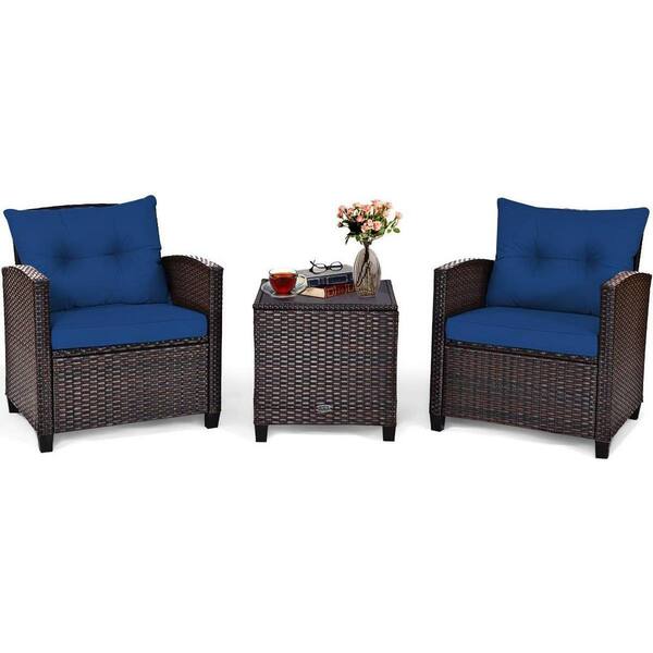 Brown 3-Piece Wicker Patio Conversation Set with Blue Cushions