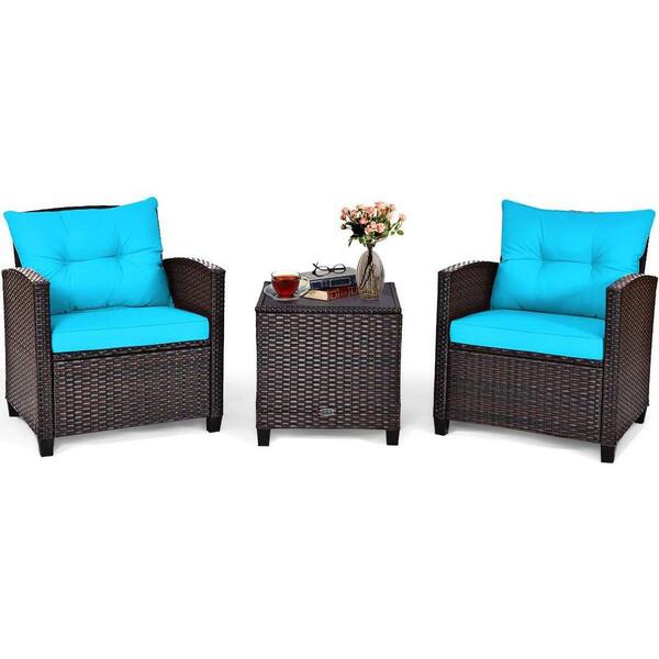 Brown 3-Piece Wicker Patio Conversation Set with Turquoise Cushions