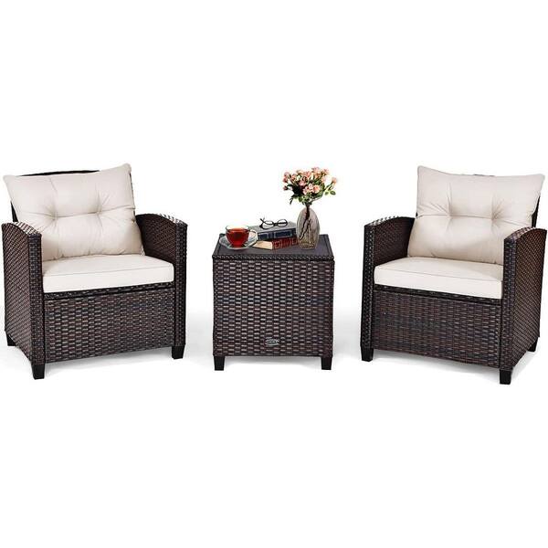 Brown 3-Piece Wicker Patio Conversation Set with White Cushions