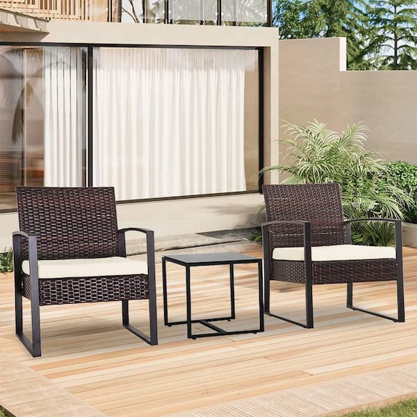 Brown 3-Piece Wicker Rattan Patio Outdoor Bistro Set with Beige Cushions, 2-Chairs and 1-Tempered Glass Table, for Lawn