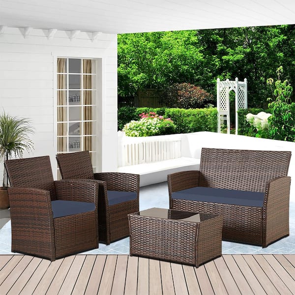Brown 4-Piece Wicker Outdoor Patio Sectional Sofa Set with Blue Cushions, 1 Coffee Table and 1 Loveseat, for Backyard