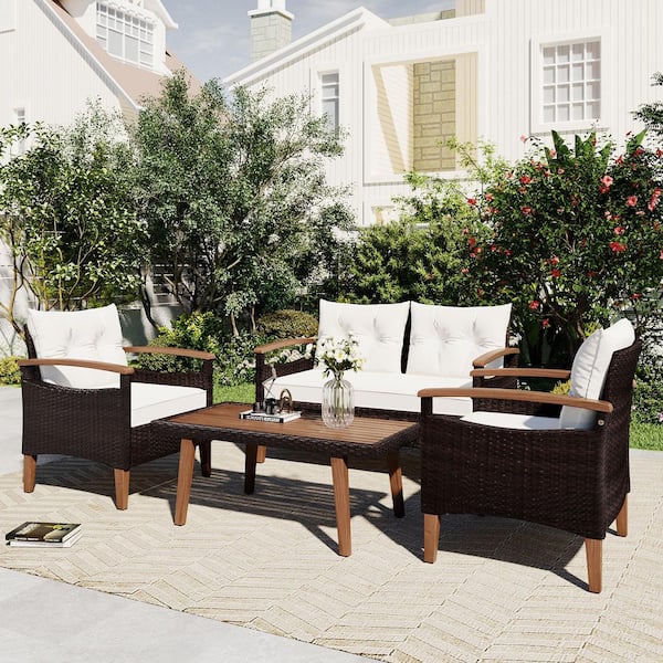 Brown 4-Piece Wicker Patio Conversation Set with Beige Cushions