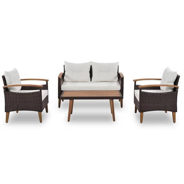Brown 4-Pieces Wicker Outdoor Sectional Set with Beige Cushions, Wood Table and Legs