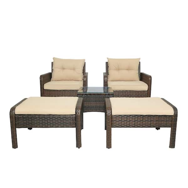 Brown 5-Piece Rattan Wicker Patio Conversation Sofa Ottoman Set with Beige Cushions