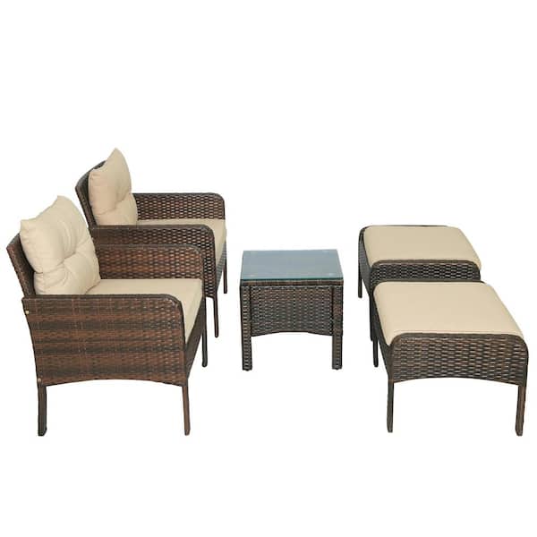 Brown 5-Piece Wicker Outdoor Patio Furniture Set Patio Conversation with Beige Cushions