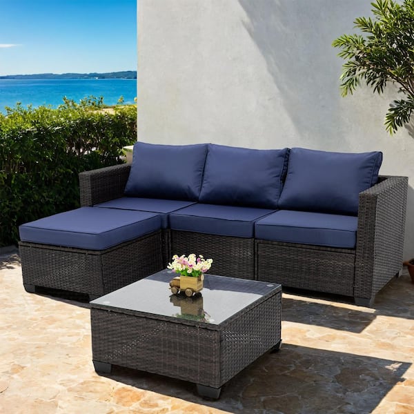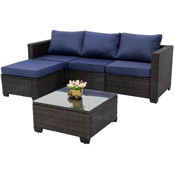 Brown 5-Piece Wicker Outdoor Sectional Set, Patio Rattan Sofa and Table Set with Dark Blue Cushions for Garden, Backyard