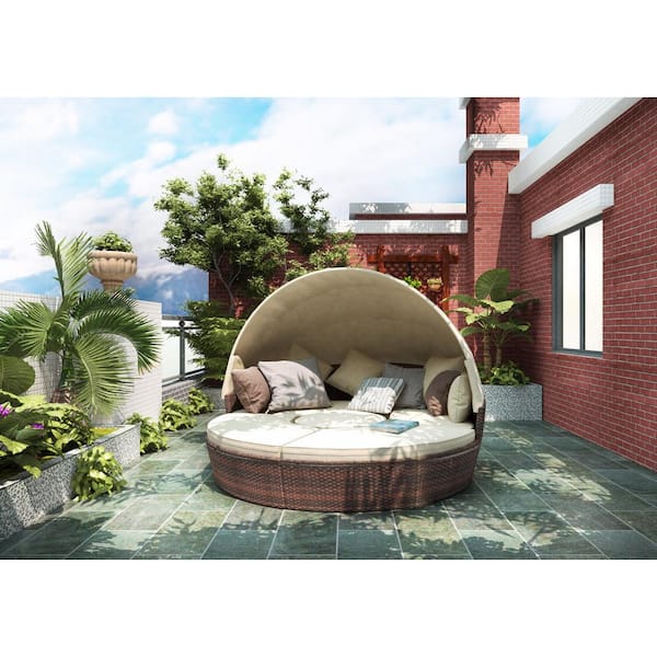 Brown 5-Pieces Wicker Outdoor Sectional Set with Beige Cushion, Separate Seating Round Outdoor Daybed Sunbed