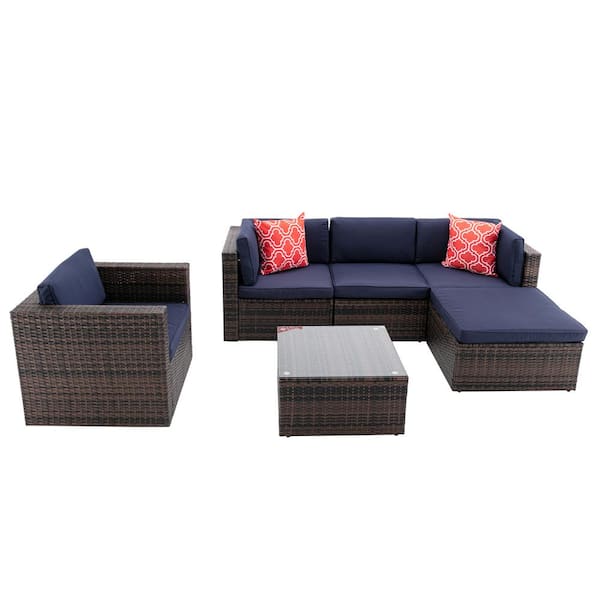 Brown 6-Piece Wicker Outdoor Sectional Set Patio Sofa Set with Navy Blue Cushions And Pillows
