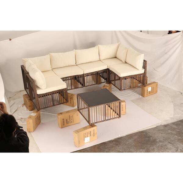 Brown 7-Piece Wide Rattan Wicker Outdoor Patio Sectional Set with Beige Cushions, 2-Corner Chairs and 1-Coffee Table