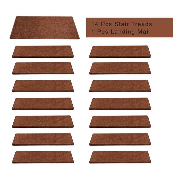 Brown 9.5 in. x 30 in. x 1.2 in. Bullnose Polypropylene Non-slip Carpet Stair Tread Cover With Landing Mat (Set of 15)