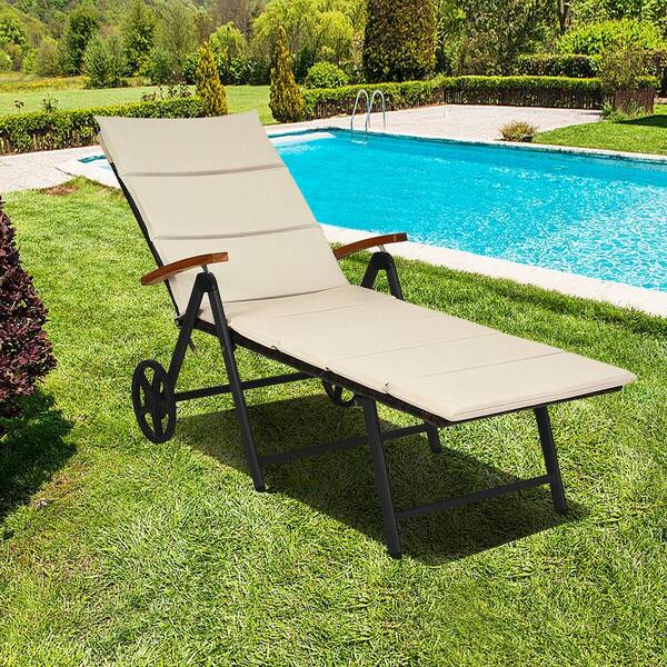 Brown Aluminum Reclining Rattan Outdoor Chaise Lounge with Wheels and Beige Cushions