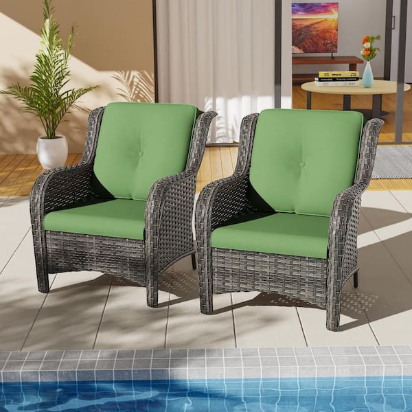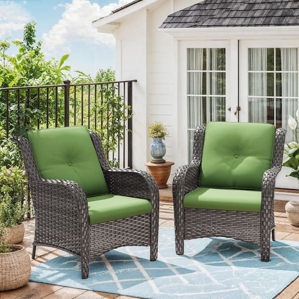 Brown Arm Ergonomic 2-Piece Patio Wicker Outdoor Lounge Chair with Green Cushion