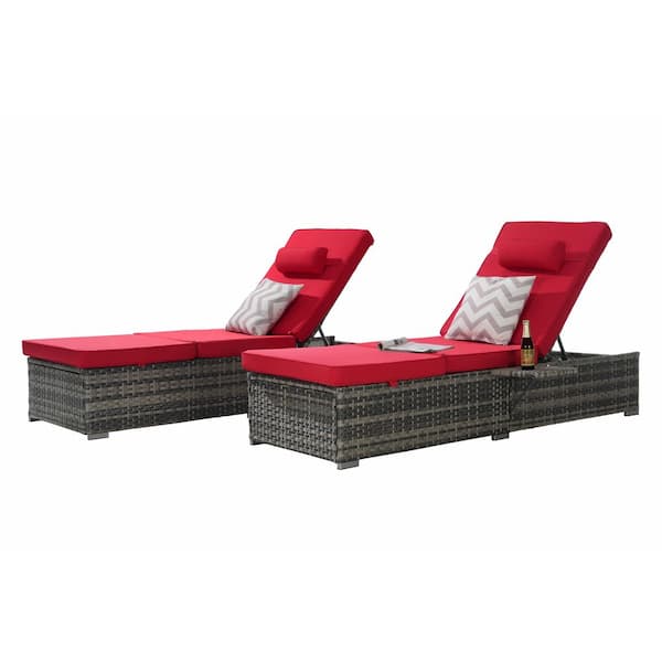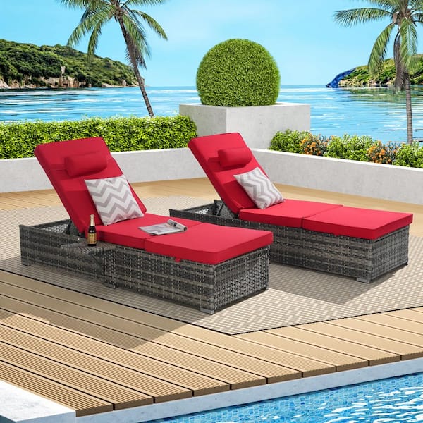 Brown Back Adjustable Wicker Outdoor Chaise Lounge Chair with Red Cushions