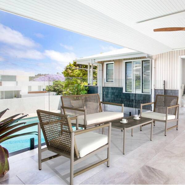 Brown Frame 4-Piece Steel and Wicker Outdoor Sectional Set with Beige Cushions and Table