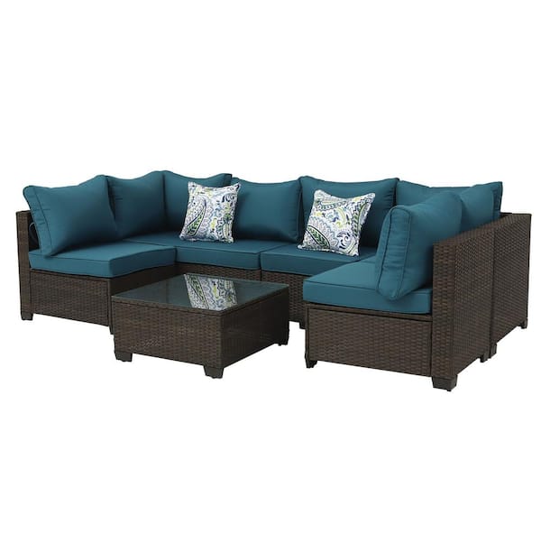 Brown Frame 7-Piece Wicker Outdoor Sofa Sectional Set with Peacock Blue Cushions