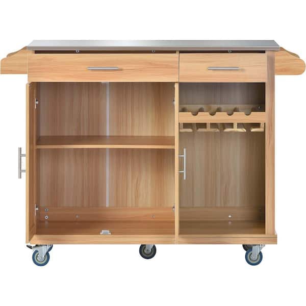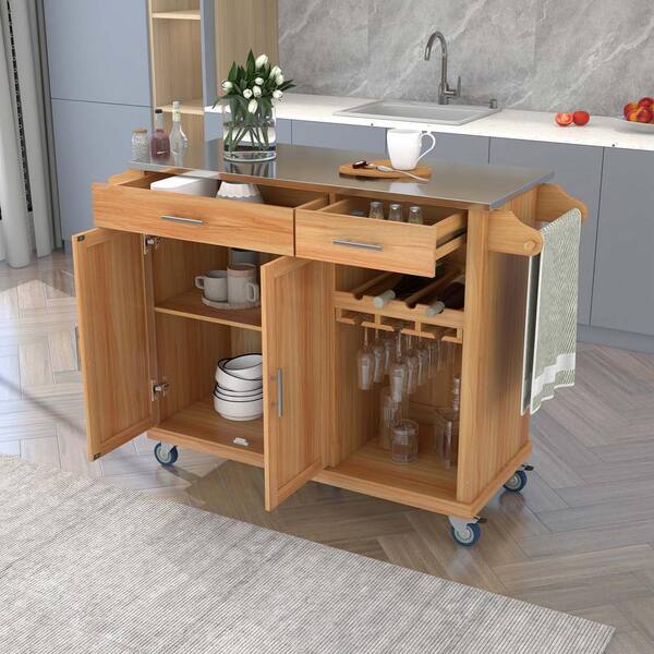 Brown Kitchen Island on Wheels with 2-Drawers and Goblet Holder