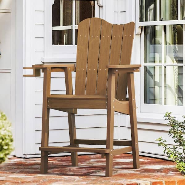 Brown-Oil Printed Plastic Adirondack Outdoor Bar Stool with Cup Holder Weather Resistant Wave Design Bar Chair
