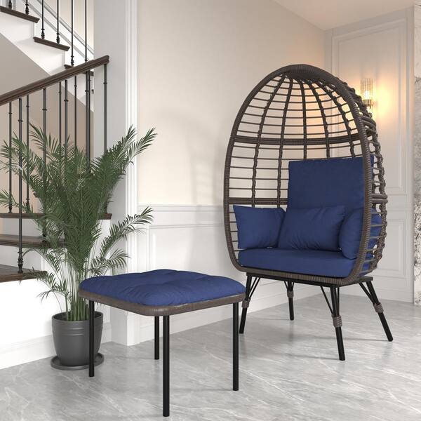 Brown PE Rattan Wicker Egg Chair with Blue Cushion and Footrest, Outdoor Lounger for Patios, Living Room