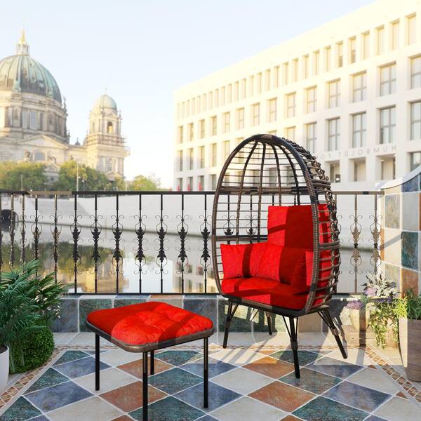 Brown PE Rattan Wicker Egg Chair with Red Cushion and Footrest, Outdoor Lounger for Patios, Living Room