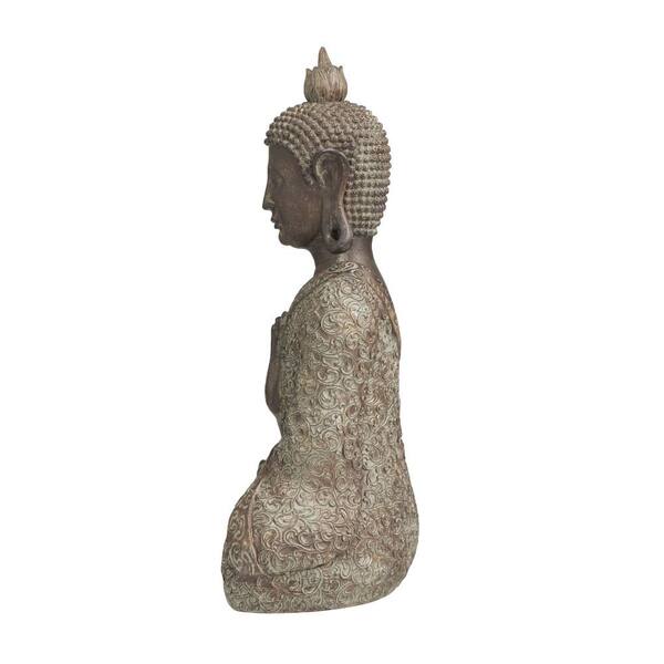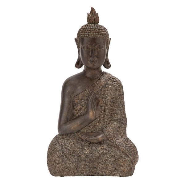 Brown Polystone Meditating Buddha Sculpture with Engraved Carvings and Relief Detailing