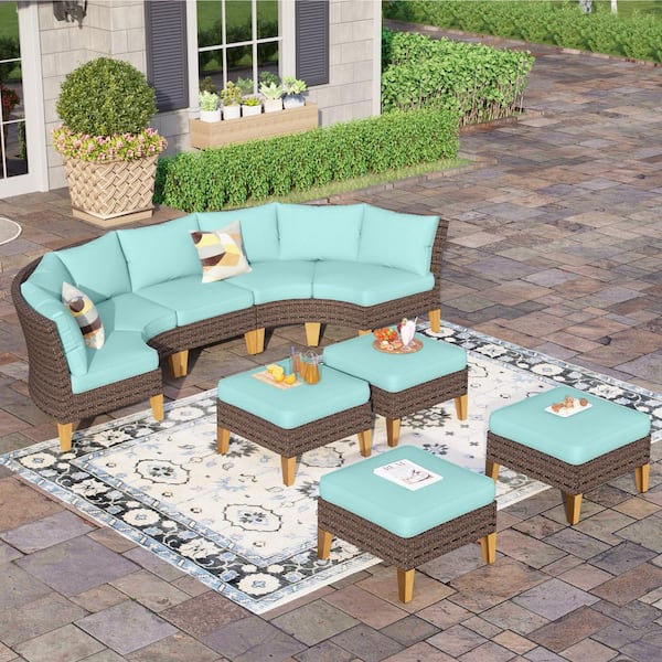 Brown Rattan Wicker 9 Seat 9-Piece Steel Patio Outdoor Sectional Set with Blue Cushions