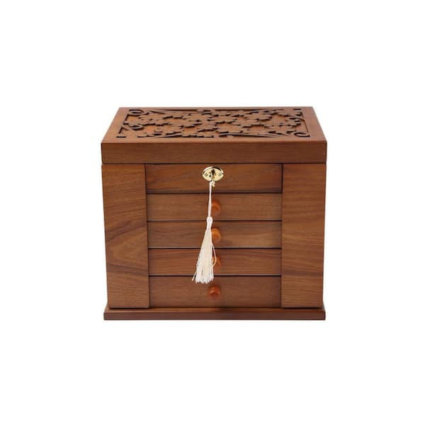 Brown Rectangular Wood Jewelry Box with Lock and Key