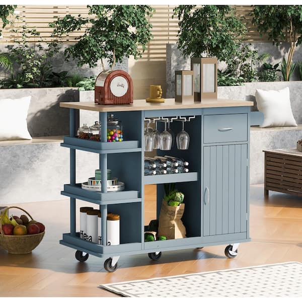 Brown Solid Wood Top 40 in. Grey Blue Kitchen Island Cart with Side Storage Shelves, Wine Glass Holder and Wine Rack
