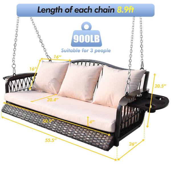 Brown Wicker 3-Seat Outdoor Porch Swing Chair with Khaki Cushions and 8.9 ft. Chains