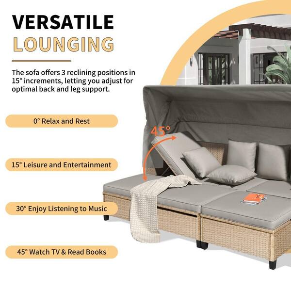 Brown Wicker 4-Piece UV-Proof Outdoor Sofa Set with Cushions, Ottoman, Retractable Canopy and Lifting Table