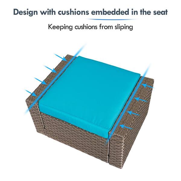 Brown Wicker Outdoor Ottoman with Blue Cushion and Glass Coffee Table (3-Piece)