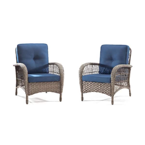 Brown Wicker Outdoor Patio Dining Chair with Blue Cushions 2-Pack