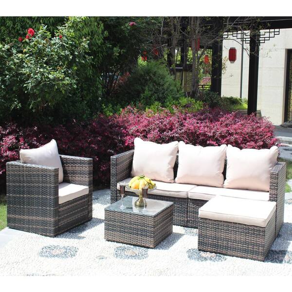 Brown Wicker Outdoor Sectional Set with Beige Cushion, Side Table Weather Resistant for Poolside Garden Backyard