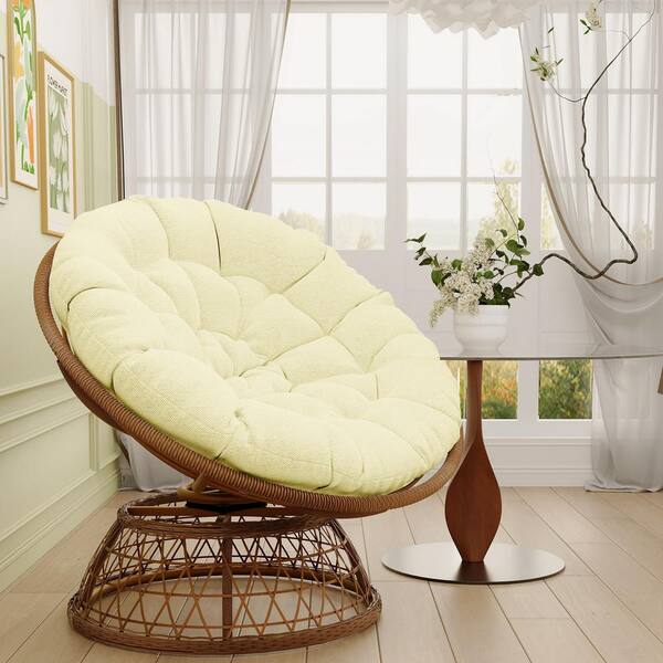 Brown Wicker Rattan Outdoor Swivel Chair with Beige Cushion, Thickened Swivel Papasan Chair for Living Room