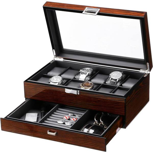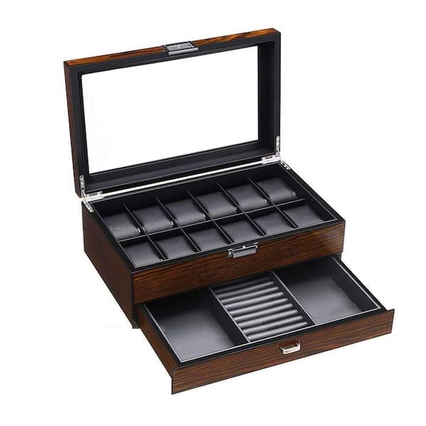Brown Wood 12-Slot Watch Box with Glass Lid