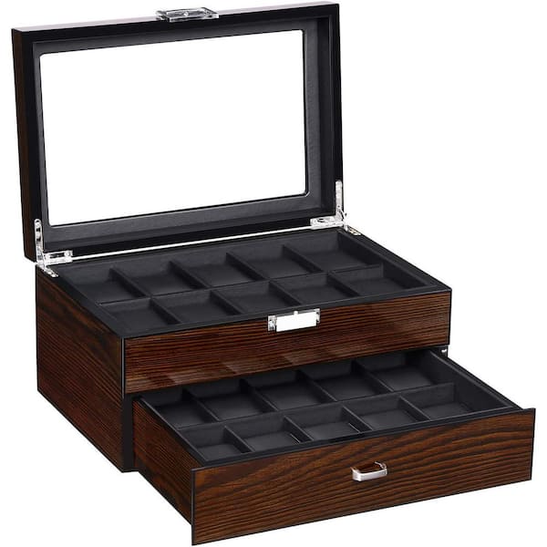 Brown Wood 20-Slot Watch Box with Glass Top