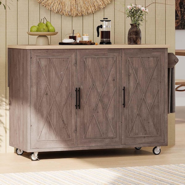 Brown Wood 51.2 in. Kitchen Island with Drop Leaf and Storage Cabinet, Portable Rolling Kitchen Island Cart
