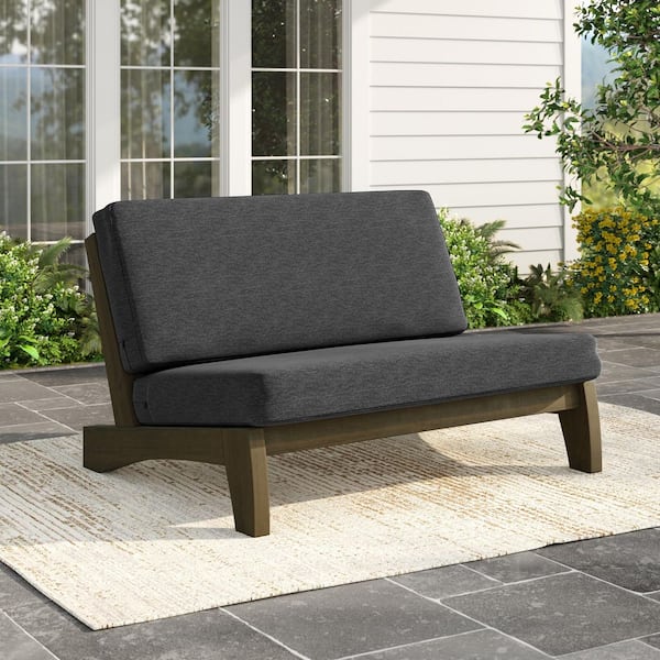 Brown Wood Outdoor Patio Loveseat with Dark Grey Cushions