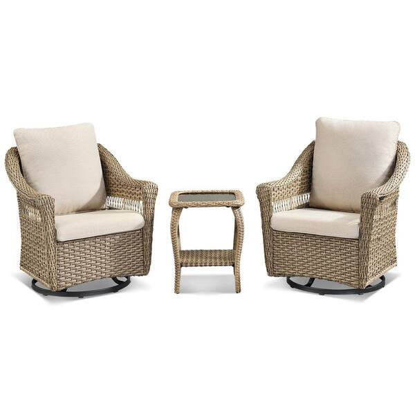 3-Piece Swivel Yellow Wicker Outdoor Bistro Set with Side Table, Patio Rocking Glider Chair Set with Beige Cushion