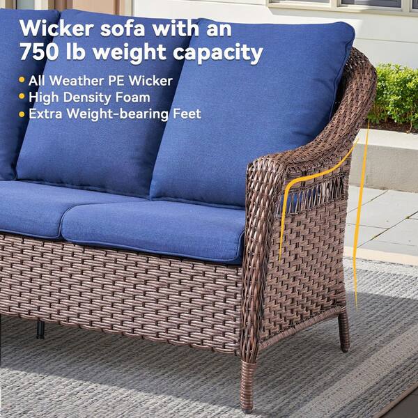 5-Piece Brown Wicker Patio Conversation Set with Swivel Glider Chair, Outdoor Sofa Seating Set with Blue Cushions