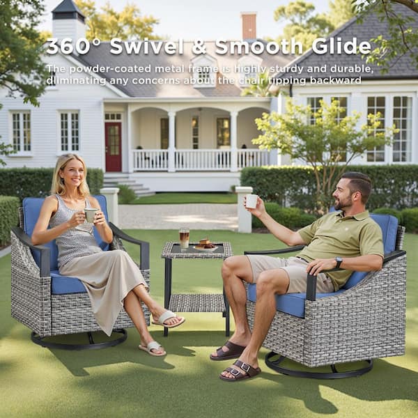 7-Piece Metal Wicker Patio Conversation Set with Swivel Glider, Outdoor Deep Seating Couch Set with Blue Cushions