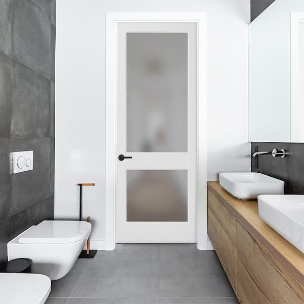 32 in. x 96 in. Solid Core 2-Lite Satin Etch Glass Square Sticking Primed Wood Interior Door Slab